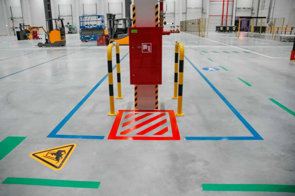 Jednym z najskuteczniejszych i najtańszych sposobów poprawy bezpieczeństwa jest czytelne oznakowanie magazynu. Wyznaczenie ścieżek pieszych, tras wózków widłowych, pasów ostrzegawczych i stref niebezpiecznych znacząco ogranicza liczbę kolizji i niebezpiecznych sytuacji.